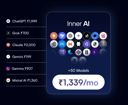 With Inner, you get access to more than 50 premium AI models for just ₹1,339 per month, saving over ₹69,900 per year.